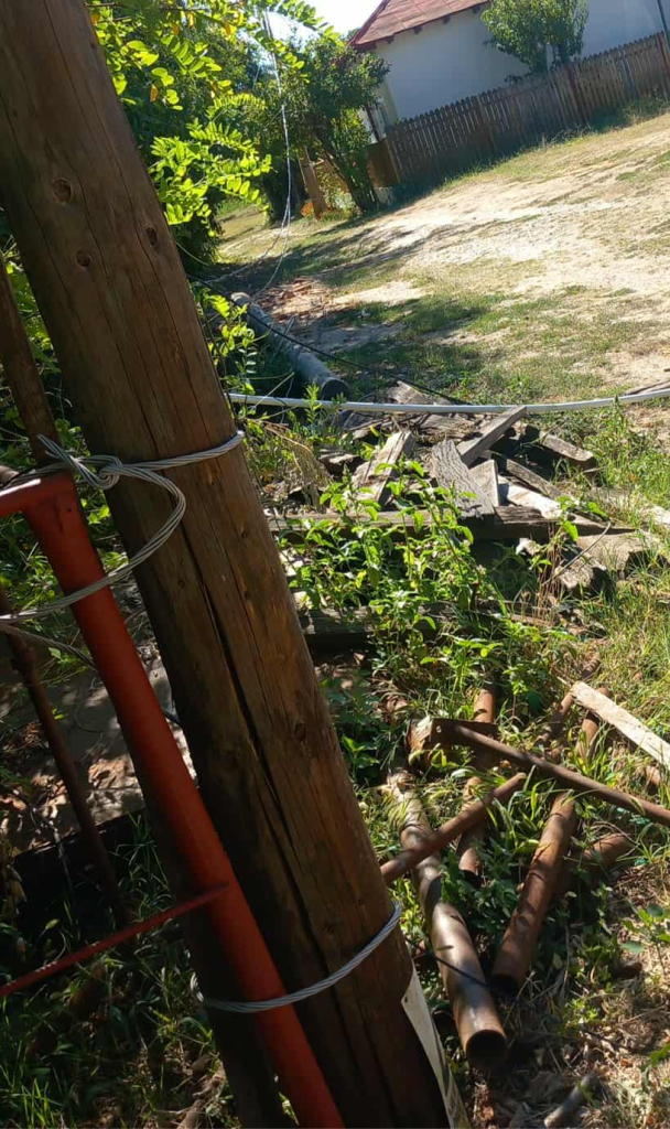 Pentru ca stâlpul căzut afectase deja și stâlpii din imediata vecinătate, angajații electrica au rezolvat situația, sau mai degrabă au pansat-o: unui stâlp i-au pus un arac de vie, iar pe altul l-au lăsat să se sprijine in cablul care duce către gospodăriile oamenilor.