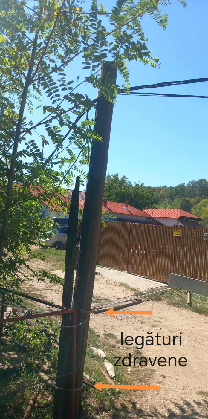 Pentru ca stâlpul căzut afectase deja și stâlpii din imediata vecinătate, angajații electrica au rezolvat situația, sau mai degrabă au pansat-o: unui stâlp i-au pus un arac de vie, iar pe altul l-au lăsat să se sprijine in cablul care duce către gospodăriile oamenilor.