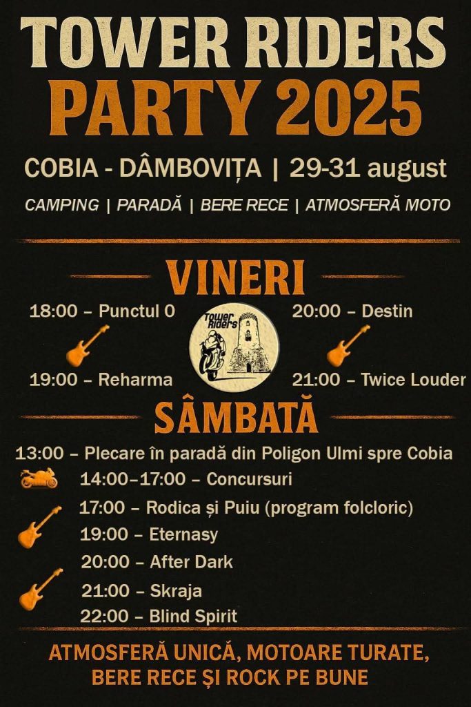 Comuna Cobia va găzdui în acest an a doua ediție a Tower Riders Party, petrecerea pasionaților de motociclete. Cei care vor reuși să ajungă la Cobia, vor avea parte de muzică bună, bere rece și bineînțeles multe motoare.