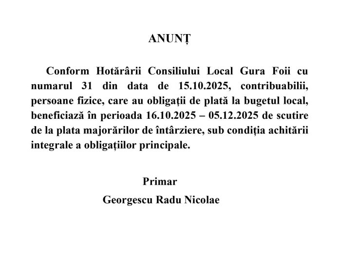 Primaria Gura Foii anunță scutirea majorării de plată pentru persoanele care achită impozitul integral până pe 5 decembrie