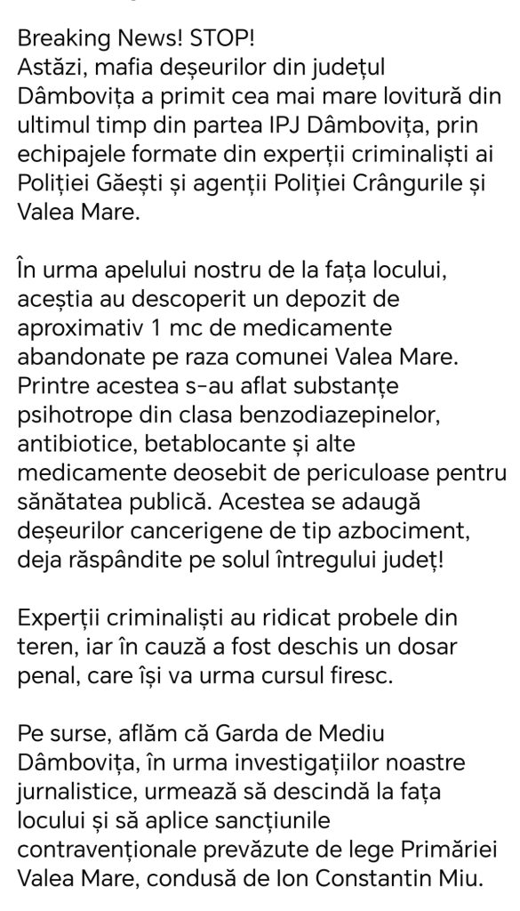 “Pe surse, aflăm că Garda de Mediu Dâmbovița, în urma investigațiilor noastre jurnalistice, urmează să descindă la fața locului și să aplice sancțiunile contravenționale prevăzute de lege Primăriei Valea Mare, condusă de Ion Constantin Miu.”