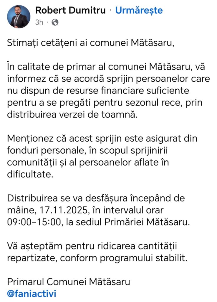 Primarul comunei Mătăsaru, Robert Dumitru, vine astfel in ajutorul familiilor nevoiașe achiziționând din bani proprii un camion de varză ce urmează a fi distribuită astăzi incepând cu ora 9, chiar în fața primăriei din Mătăsaru. Anunțul este făcut chiar de tânărul primar al localității, Robert Dumitru, pe pagina sa de socializare , iar persoanele doritoare sunt așteptate între orele 9 și 15 la primăria din localitatea Mătăsaru.