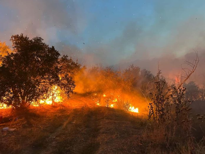 Aici, incendiul se manifestă pe o suprafață de aproximativ 2 hectare de vegetație uscată în proximitatea locuințelor.